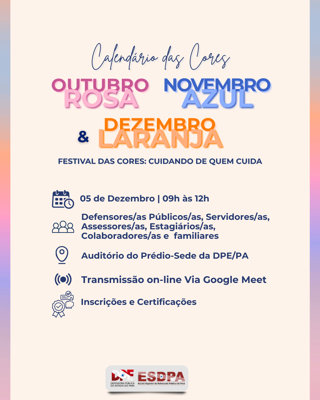 A Escola Superior da Defensoria Pública do Pará, em parceria com o setor de saúde ocupacional, realizou o evento: “Calendário das Cores - Festival das Cores: cuidando de quem cuida”.